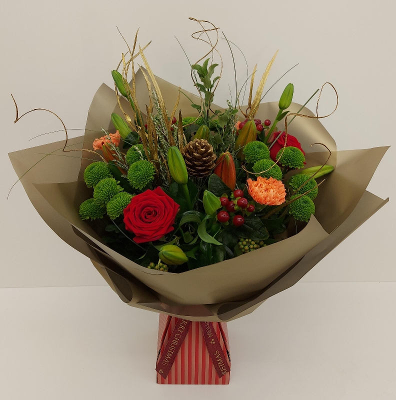 Arranged as a hand-tied in water, this bouquet will bring Christmas cheer to your home.